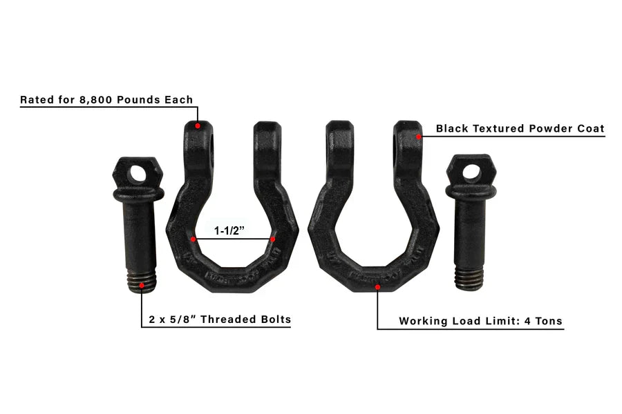 Engineered from heavy-duty alloy steel, each shackle is rated for up to 8,800 lbs., with a working load limit of 4T which is clearly stamped on the shackle to meet DOT requirements.