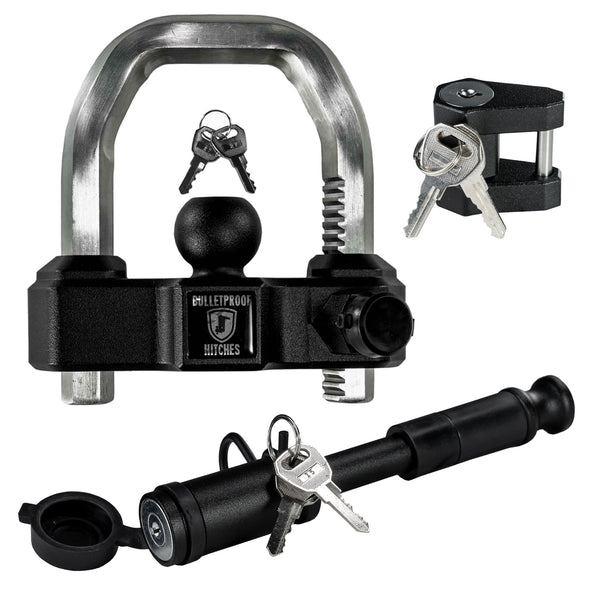 For those who demand more than basic security, the BulletProof Black Ops Extreme Trailer Lock Set delivers rugged, high-performance protection. This all-in-one set locks down every critical connection point - securing your hitch in the receiver tube, locking the trailer latch in place, and keeping your trailer safe when parked or stored.